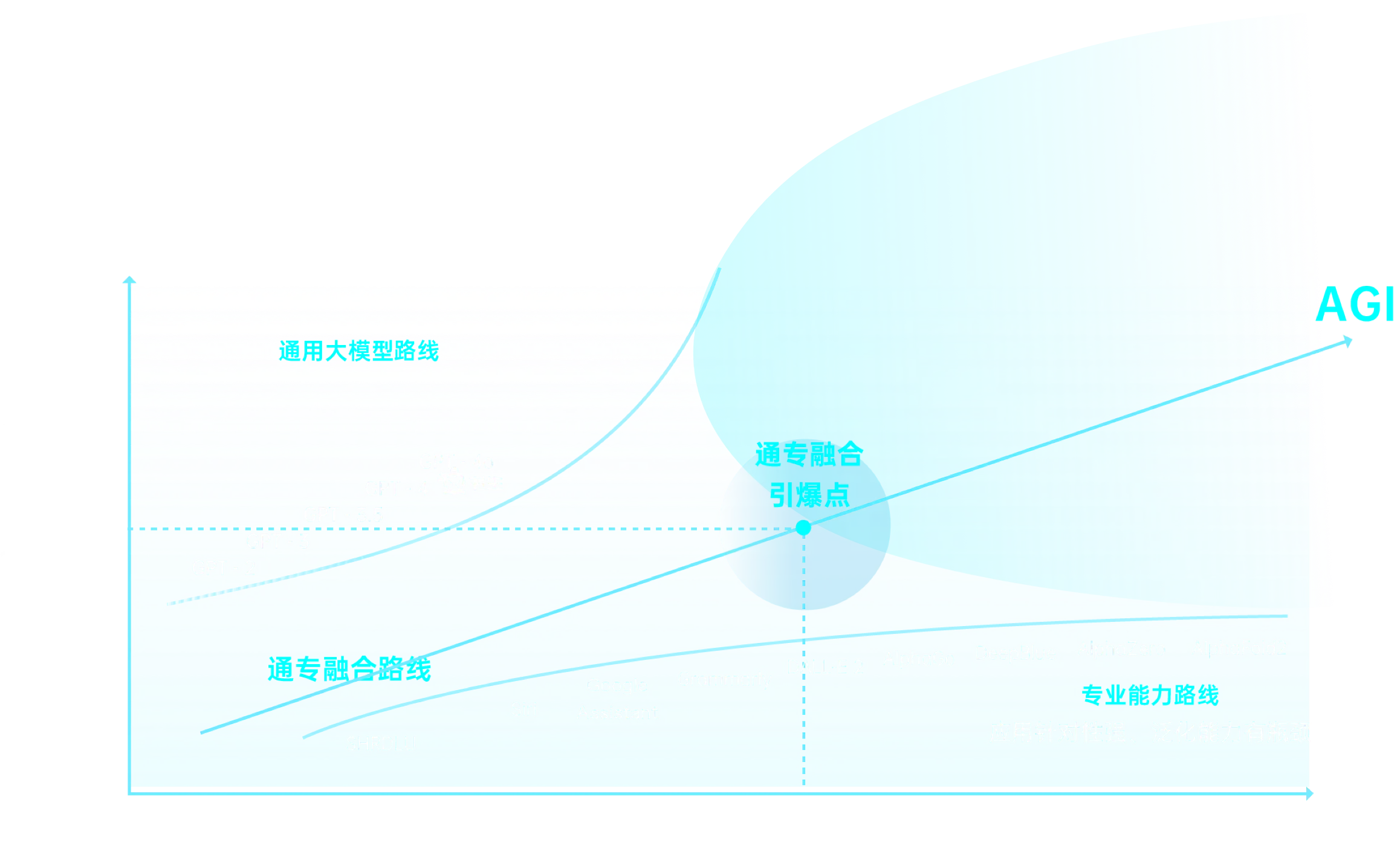 未来,AGI将落地在一个高价值区域,这个区域离原点最近的点,被称之为通专融合引爆点;从当前技术出发,能最快地接近通专融合引爆点的路线,即为通专融合技术路线。